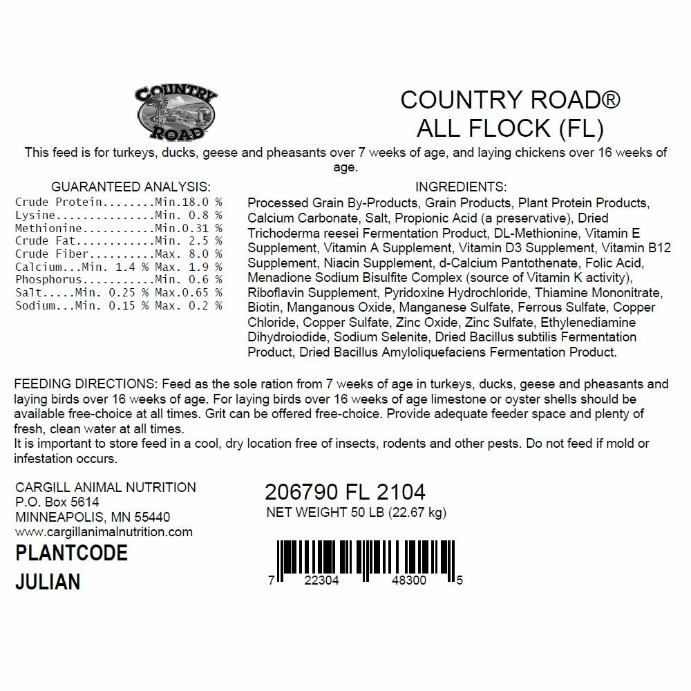 Designed to meet the needs of many species of poultry, Country Road All Flock is the perfect solution for mixed flocks. This complete feed offers balanced nutrition for birds older than 7 weeks, including turkeys, ducks, geese, pheasants and chickens. Your birds will love this highly palatable formula, you’ll love its nutritional profile. Packed with 18% protein and fortified to support strong healthy birds, Country Road All Flock makes it easy to give your birds the nutrition they need.