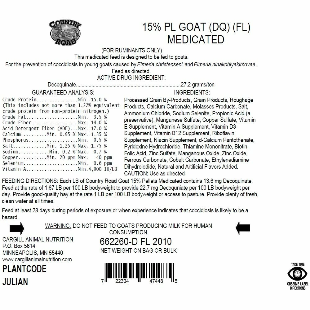 - Each lb. of Country Road Goat 15% Pellets Medicated contains 13.6 mg Decoquinate.