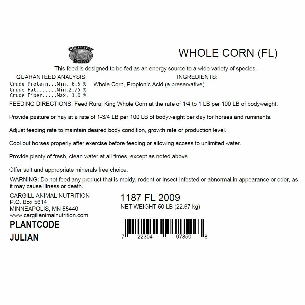 Corn is a great source of energy and nutrition for a variety of animals, from chickens to cows. Fresh and tasty, Country Road Whole Corn is carefully selected from premium quality grain and thoroughly cleaned to reduce the presence of foreign material and feed dust.