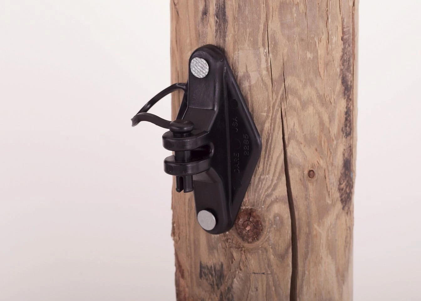 for wood posts. Heavy cross sections withstand the pressure of high tensile fencing. Attached pin, locks and unlocks fence wire. Large flange prevents ‘shorts’ andarcing. Molded of high density polyethylene with carbon black for superior UV resistance. Performs inany climate. Black.