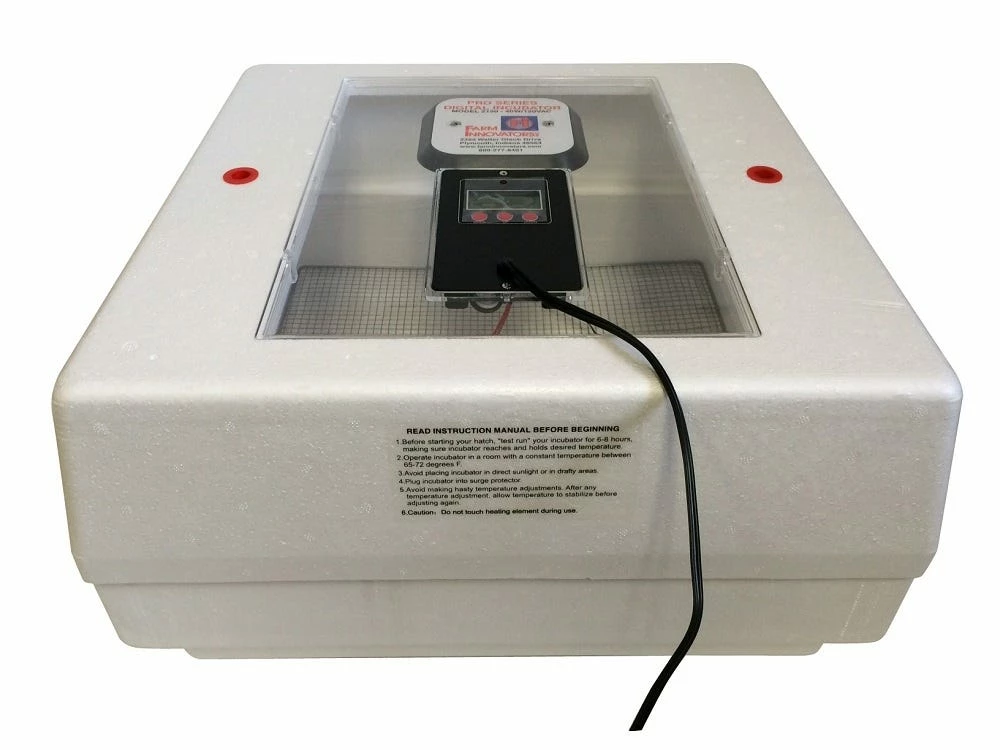 You’ll be welcoming baby chicks in no time with the Farm Innovators Circulated Air Digital Bird Incubator. Equipped with a convenient digital display that shows temperature, humidity and days to hatch, this incubator pulls in and circulates fresh air to stabilize temperature for improved hatching. The days to hatch countdown is set at 21 days, but can be adjusted for a variety of eggs. This eco-friendly product—made with recycled polystyrene foam—also features Incutek heating technology to quickly create the ideal temperature and environment for eggs – heating to factory pre-set temperature of 100 F within minutes. A large picture window allows for 360° unobstructed views inside incubator – Great for educational observation.
