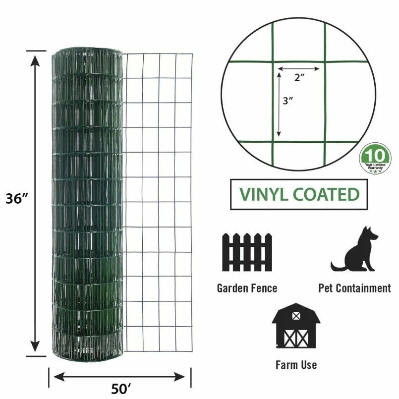 36 In. H x 50 ft L green vinyl garden fence provides an attractive, low visibility an extremely durable option for lawn and garden fencing. Can be applied to wood or u-channel fence posts. Green vinyl coating protects steel wire form rust and corrosion.