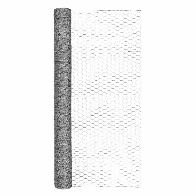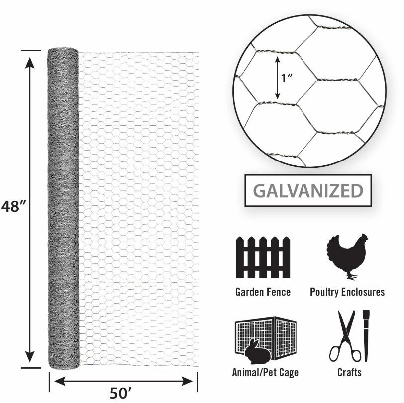 48in H x 50ft W Galvanized Hex Netting features a 1in hexagonal mesh weave design and is both lightweight and easy to use. The hex netting is galvanized with a zinc coating for added durability and to help prevent rusting. Chicken wire has many uses such as animal containment, plant protection and support, fencing applications, and many more.