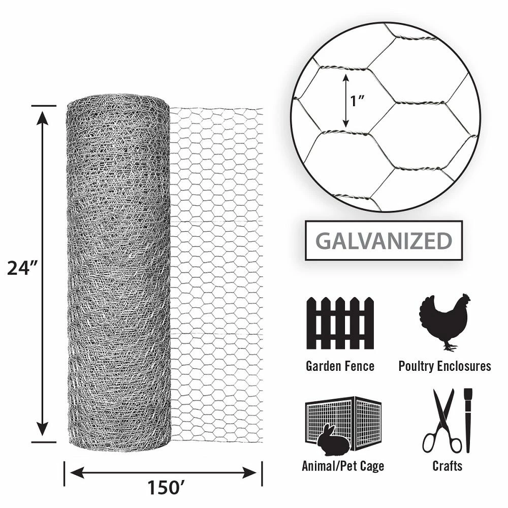 24in H x 150ft L galvanized poultry netting features a 1in hexagonal mesh weave and is both lightweight and durable. This is an extremely versatile product that can be used for a number of applications, including animal containment, temporary fences, chicken coups and cages, and craft projects. It provides great protection and support for plants, erosion control, and compost containment. Poultry Netting is an economical solution that is easy to install and alter to meet your needs.