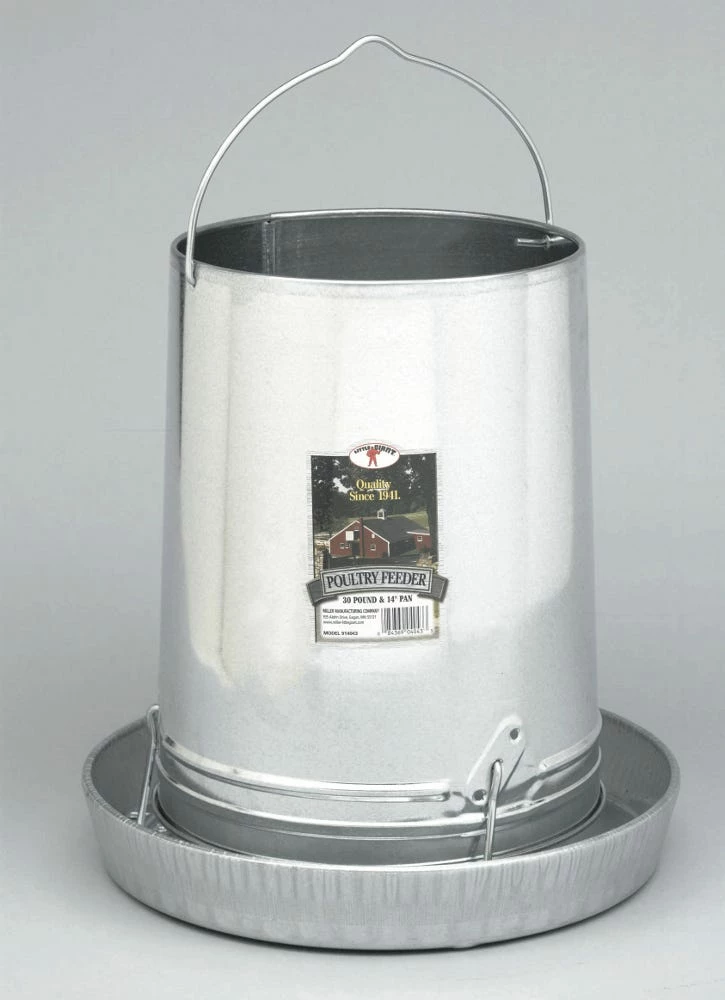Hanging feeders save floor space, reduce waste by eliminating scratching, and cut down on debris in the feed. Constructed of heavy-gauge galvanized steel for many years of service, with rolled edges for safety. Hanging handle included. Tube is 10.75 inch diameter by 13.875 inch high; pan is 14.25 inch diameter by 2.25 inch high. Holds approximately 30 pounds of feed.