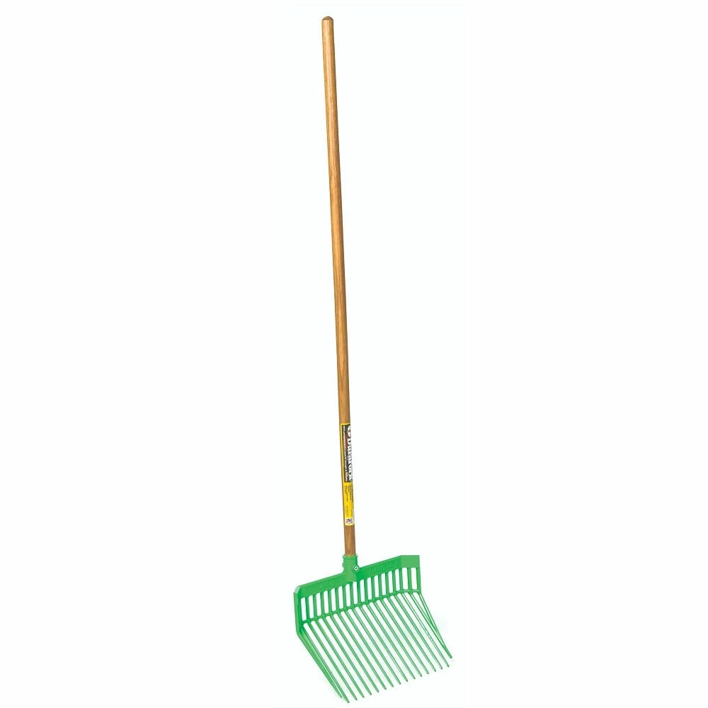 This is the original Little Giant DuraFork bedding fork that is a fixture in stables and barns everywhere. Manufactured from extra-strong 100 percent polycarbonate to provide super strength and flexibility. Designed for long-lasting use around the farm, ranch, and home. Specially designed tines are uniquely angled to provide easy manure pickup with less spilling. Nylon locknut secures the 52 inch long by 1.125 inch diameter hardwood handle. Fork head is 13.125 inch long by 15.125 inch wide. Lime green fork head.