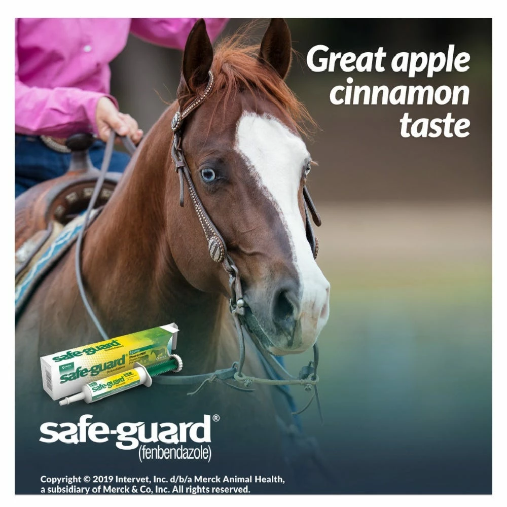 Safe-Guard Equine Paste provides safe and effective treatment and control of large strongyles, encysted early third stage, late third stage and fourth stage cyathostome larvae, small strongyles, pinworms, ascarids and arteritis caused by fourth stage larvae of strongylus vulgaris in horses. It features an apple-cinnamon taste that ensures less waste and is safe in horses, even foals and pregnant mares.
