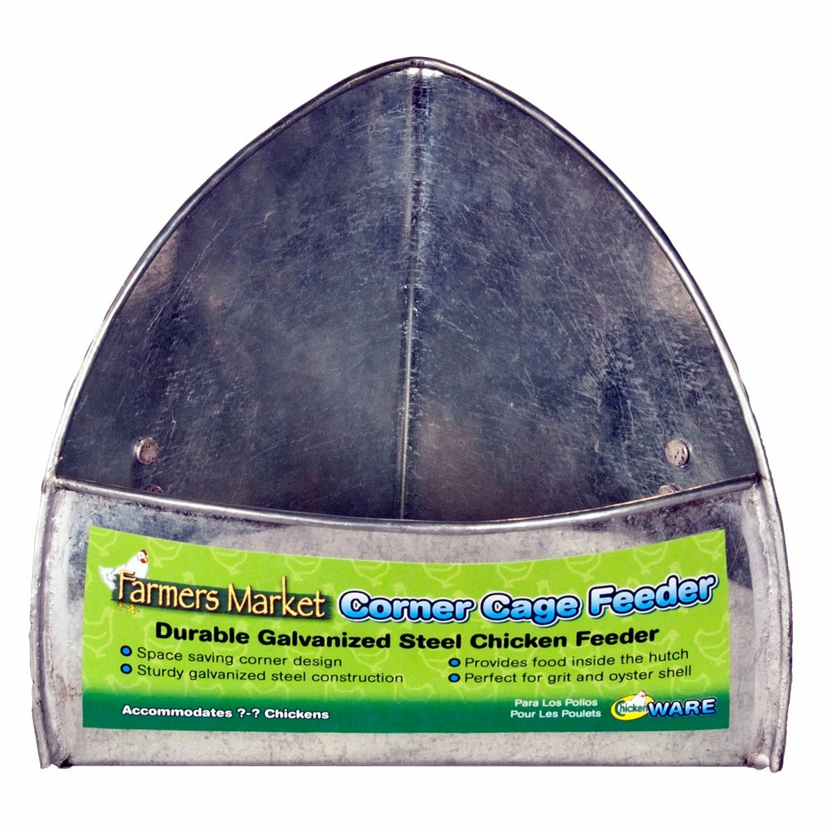 Corner Feeder offers a space saving corner design in rugged galvanized steel, perfect for offering grit or oyster shell.