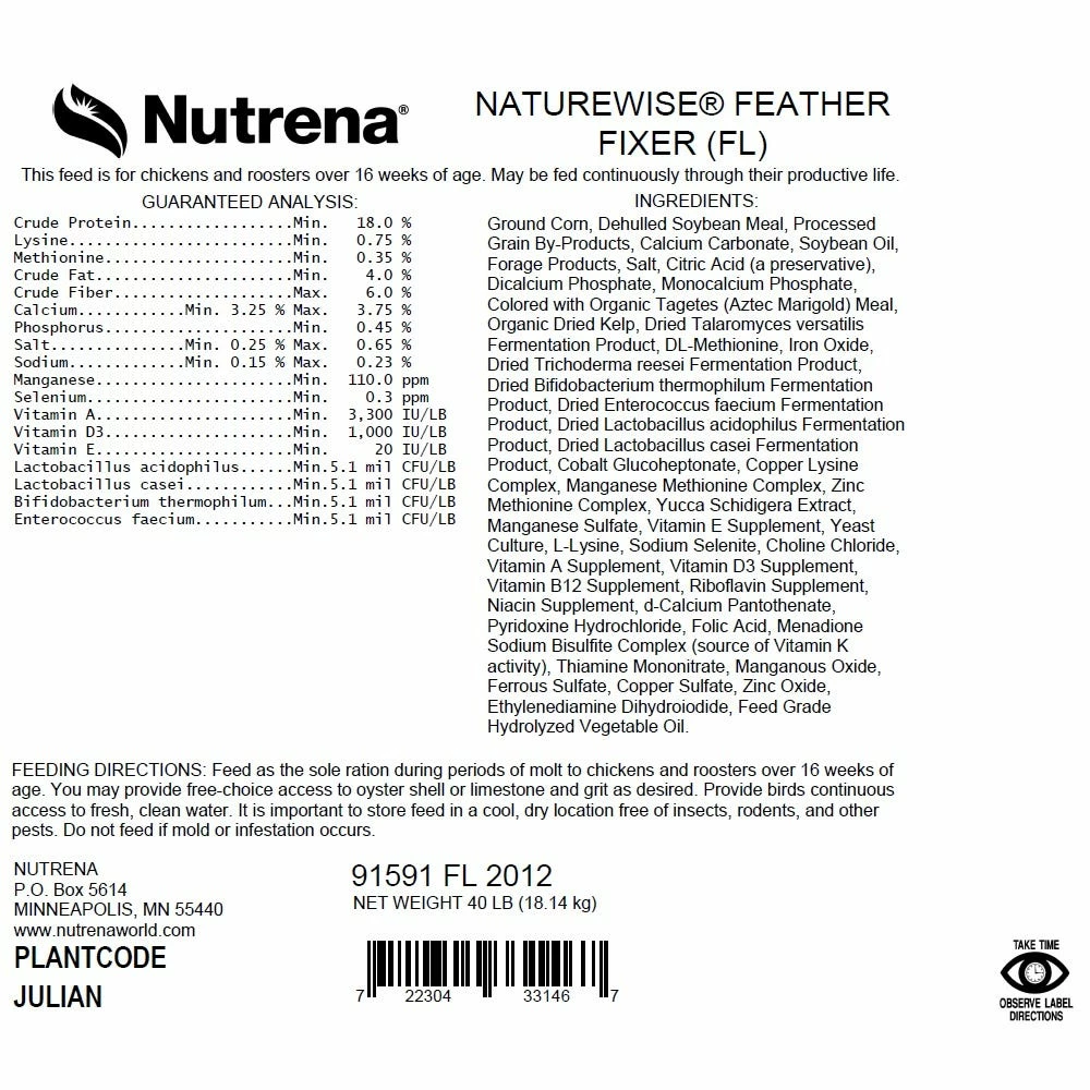 - Feed as the sole ration at the first sign of feather loss for hens and roosters over 16 weeks of age; transition to NatureWise Layer 16% after molting is complete