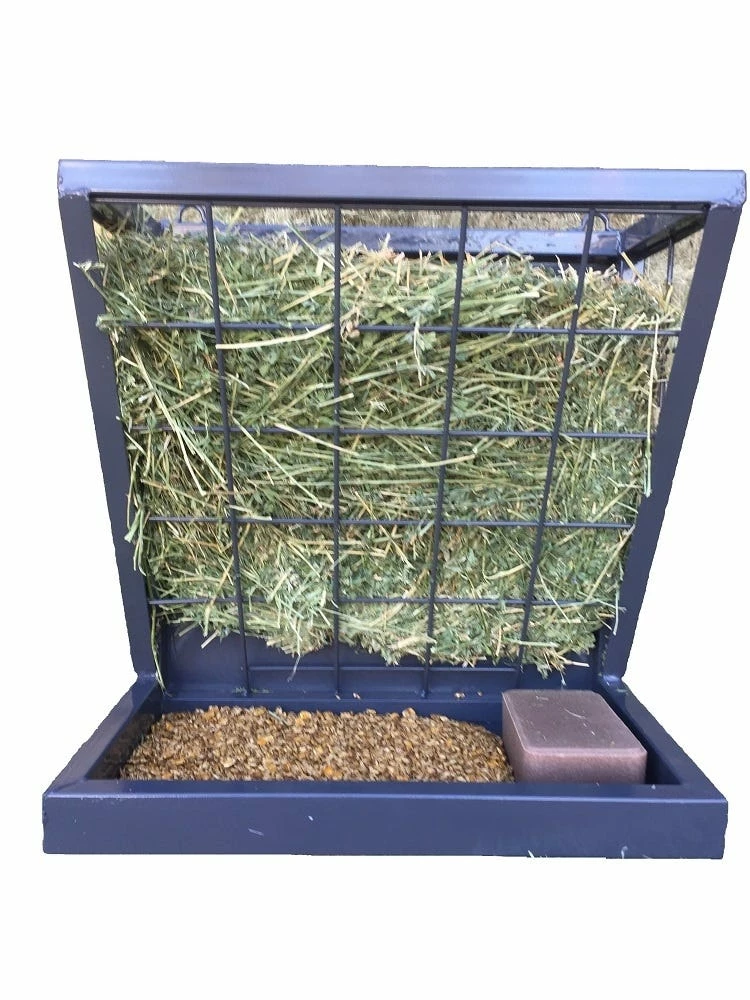 Powder coated steel feeder that conveniently holds both hay and grain. This combination feeder is great for kidding season or the show circuit. Sturdy clips on back allow for easy hanging on panels. 21″ tall x 21″ wide x 14″ deep.