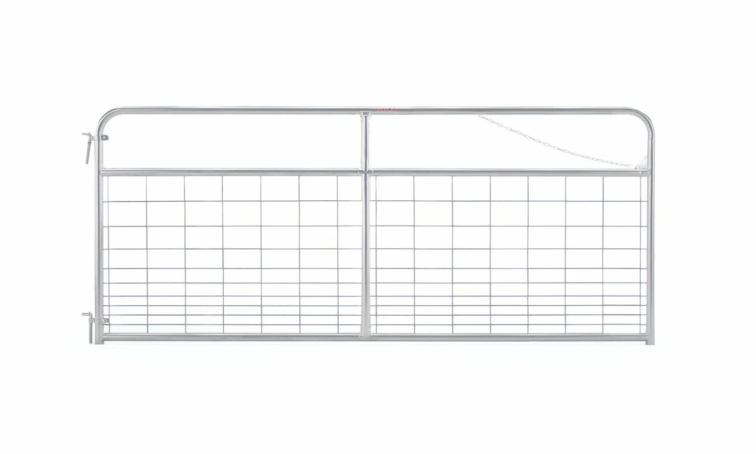 Tarter’s Watchmen Wire Mesh Gate provides secure confinement options for horses and smaller livestock, utilizing 8 gauge, 2”x4” wire mesh. This gate features 1.75” steel tubing and a long-lasting corrosion-resistant finish. This gate comes ready to hang with hinge pins that are adjustable so the gate can open on either side. A snap chain is also included.