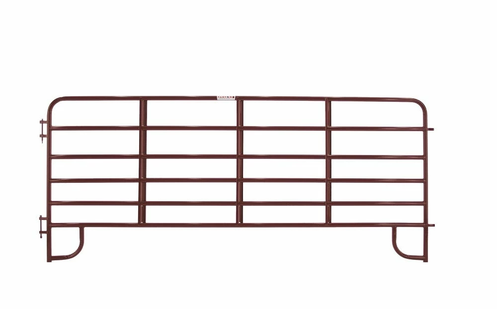 Tarter’s 6-Bar Heavy-Duty Standard Corral Panel is idea for light to medium confinement of livestock in round pens and working areas. Constructed of 1-3/4″ round high tensile strength steel tubing and featuring our continuous-welded saddle joints for longevity in the field. The 6-Bar Heavy-Duty Standard Corral Panel features our quick-pin latch system for easy hookup and custom loop legs prevent sinking.