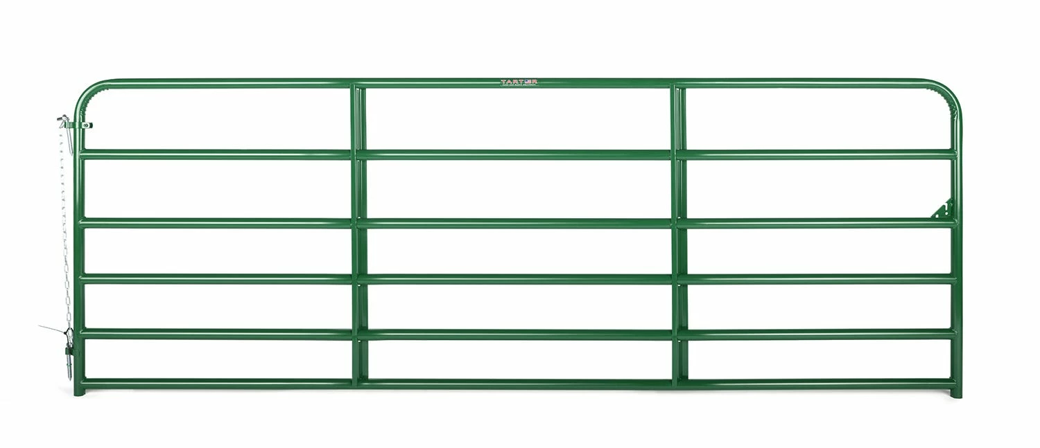 Tarter’s 6-Bar Economy Tube Gate is the perfect gate for access between pastures and entry ways. This gate stands 50″ high with vertical Z braces and is constructed of 1-3/4″ high tensile strength tubing. Featuring continuous-welded saddle joints and our durable, corrosion resistant powder-coat finish for superior longevity. Available in 4′ – 20′.
