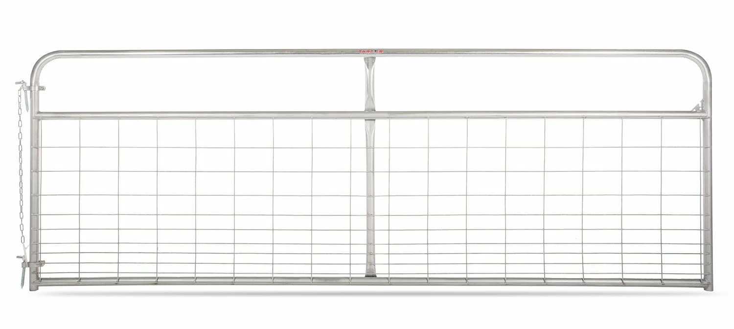 Tarter’s Watchmen Wire Mesh Gate provides secure confinement options for horses and smaller livestock, utilizing 8 gauge, 2”x4” wire mesh. This gate features 1.75” steel tubing and a long-lasting corrosion-resistant finish. This gate comes ready to hang with hinge pins that are adjustable so the gate can open on either side. A snap chain is also included.