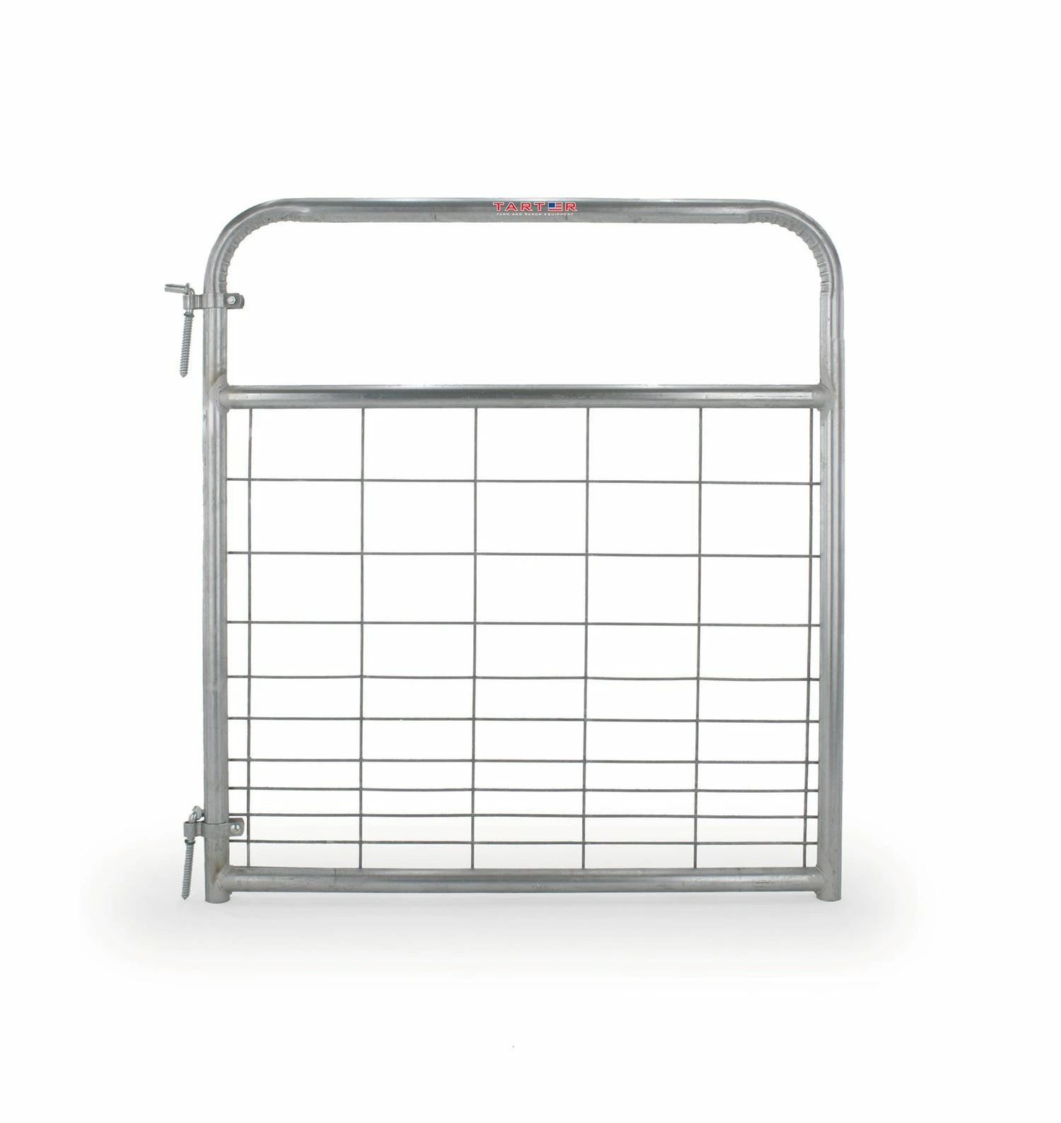 Tarter’s Watchmen Wire Mesh Gate provides secure confinement options for horses and smaller livestock, utilizing 8 gauge, 2”x4” wire mesh. This gate features 1.75” steel tubing and a long-lasting corrosion-resistant finish. This gate comes ready to hang with hinge pins that are adjustable so the gate can open on either side. A snap chain is also included.