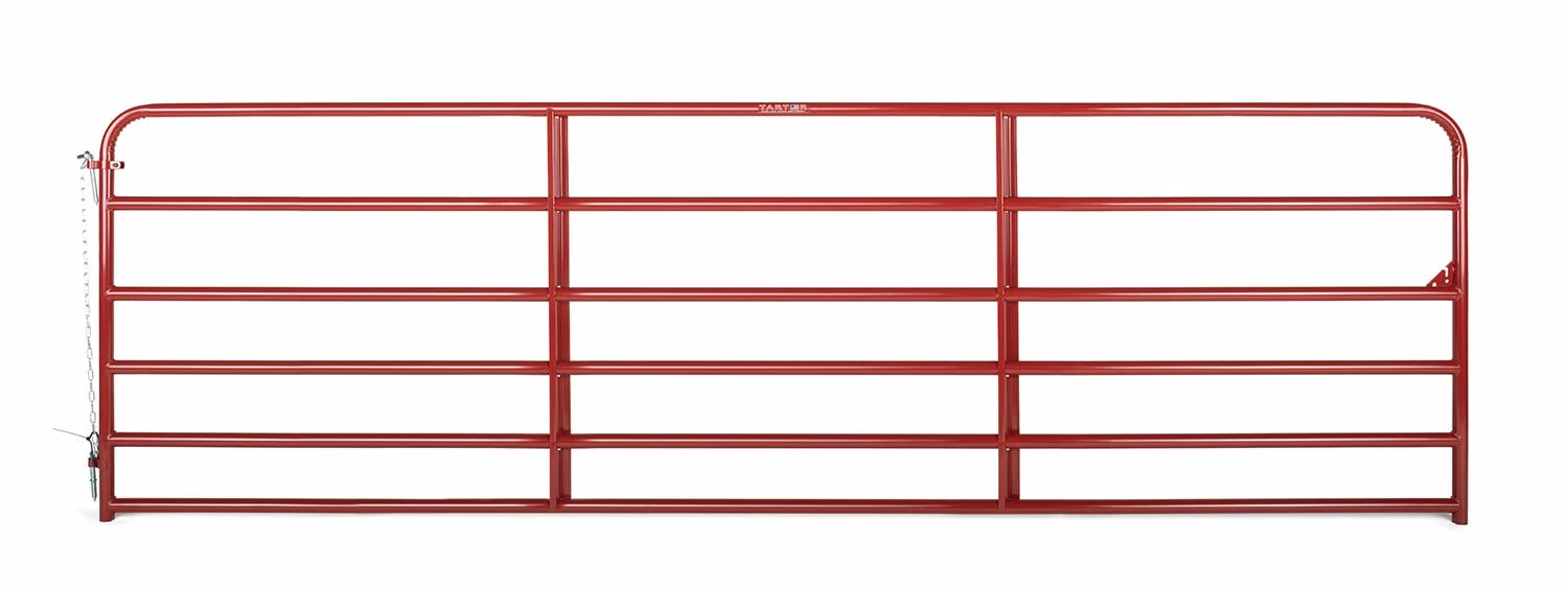 Tarter’s 6-Bar Economy Tube Gate is the perfect gate for access between pastures and entry ways. This gate stands 50″ high with vertical Z braces and is constructed of 1-3/4″ high tensile strength tubing. Featuring continuous-welded saddle joints and our durable, corrosion resistant powder-coat finish for superior longevity. Available in 4′ – 20′.