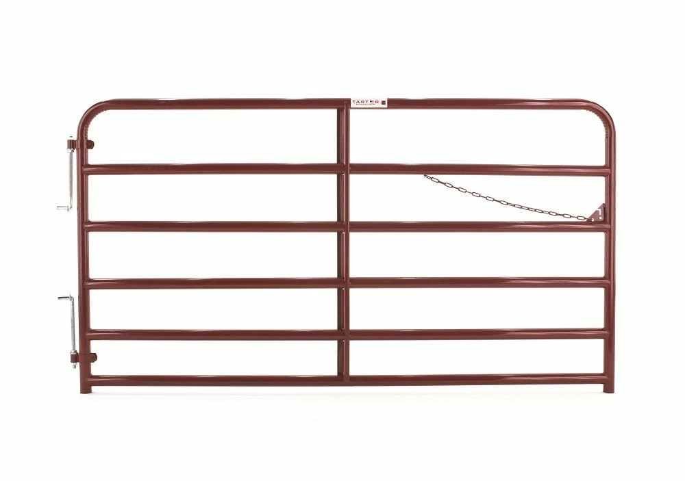 Tarter’s 2″” 6-Bar Extra-Heavy-Duty Bull Gate is designed for heavy confinement environments such as feedlots and large herd containment. Constructed of 2″ round high tensile strength tubing and featuring Z braces and continuous-welded saddle joints, this gate is among the strongest available. It is available in 4′ – 20′ and comes ready to hang with all hardware included.