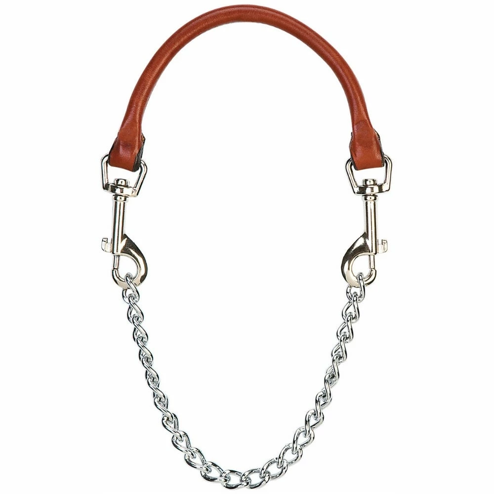 This 5/8″ goat collar is constructed from rolled chestnut bridle leather with smoothed and darkened edges and durable chrome plated chain. The rolled bridle leather handle is soft, smooth and feels great in the hand and helps you maintain control. The chrome plated snaps allow the sizing to be adjusted easily by simply snapping into any link for the perfect fit! Overall length of collar includes handle. Made by Weaver.